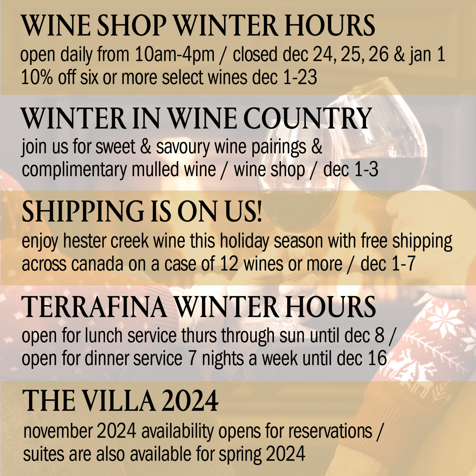 We will be offering complimentary tastings throughout December and from December 1st to 23rd, we will be providing a 10% discount on selected wines and merchandise when you make a minimum purchase of six wines.