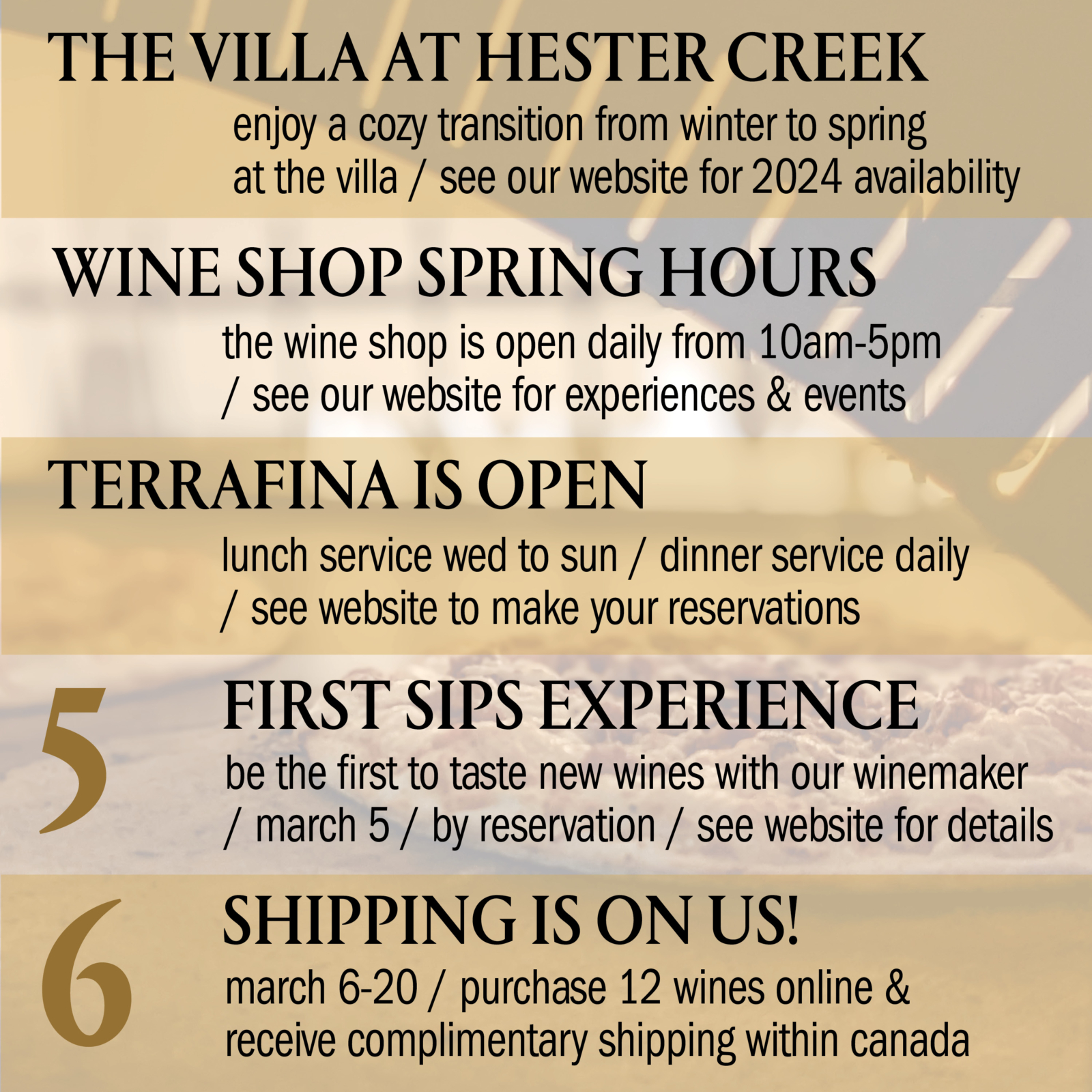 So, with that being said, get ready to March into spring with Hester Creek and the whole Okanagan.